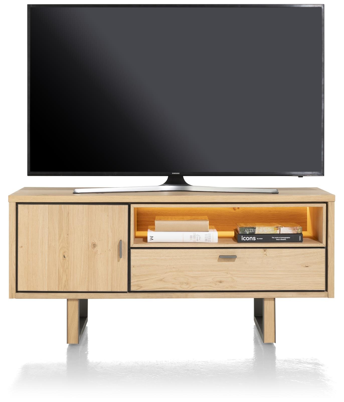 Masivní dubová komoda, která jednoduše zazáří u vás doma. Jednoduchost a elegance v každém detailu. Nejvýraznější věcí jsou jemné úchytky a nohy s dřevěným vykládáním. Ty dodávají kolekci pěkný a přirozený vzhled. Otevřená přihrádka byla také ponechána volná pro váš TV dekodér, který je zase decentně osvětlen vestavěným LED osvětlením. Tato tv komoda má kromě otevřené přihrádky také prostornou zásuvku uprostřed.