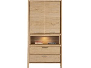 Tato moderní dubová komoda s černými kovovými detaily je ideální volbou pro každého, kdo hledá kvalitní nábytek s nadčasovým vzhledem a chytrým úložným řešením. Dvě zásuvky, otevřená přihrádka a několik polic nabízí dostatek prostoru pro nádobí, dokumenty nebo jiné věci. Integrované LED osvětlení zaostří na otevřenou polici. Na horní desce máte ještě více místa pro své nejkrásnější upomínkové předměty.
